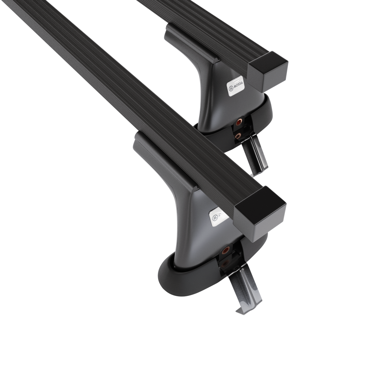 - Základný strešný nosič pozostáva z 2 pevných oceľových nosníkov a 4 držiakov (tzv. pätiek) <