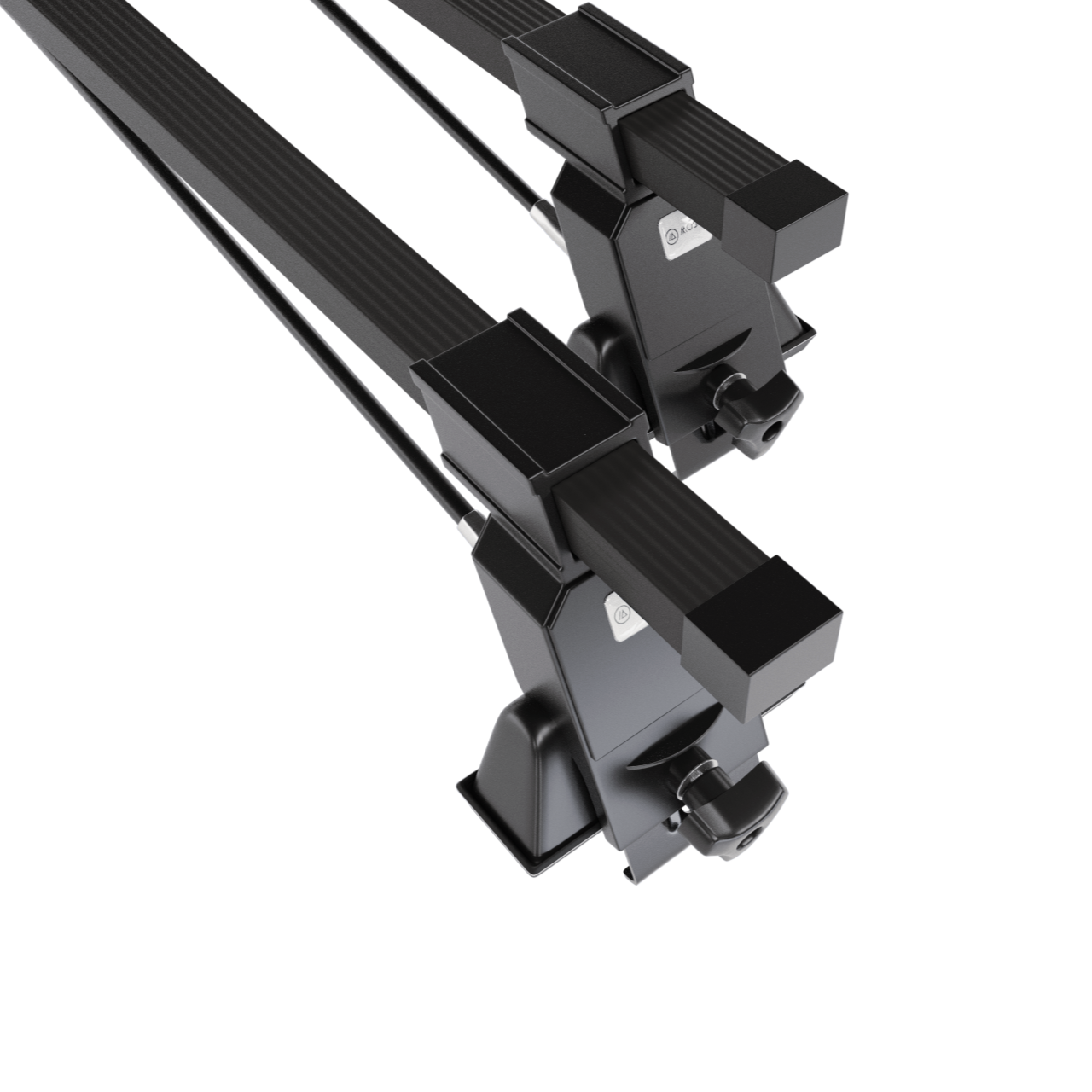- Základný strešný nosič pozostáva z 2 pevných oceľových nosníkov a 4 držiakov (tzv. pätiek) <